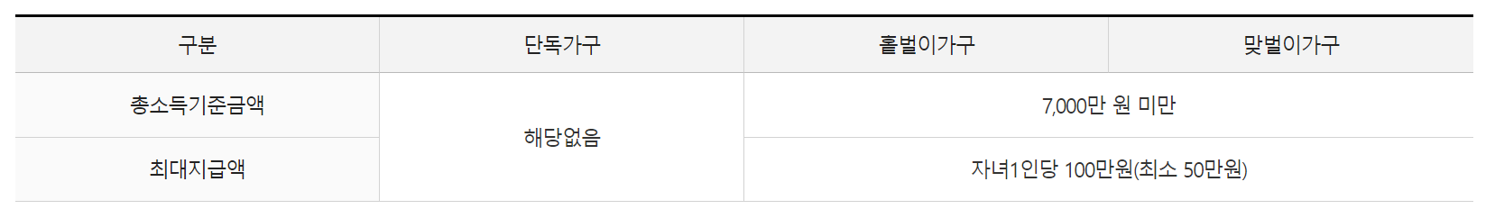부부합산 연소득 7천만 원 이하, 부양 자녀(만 18세 미만)가 있는 저소득 가구에 1인당 최대 100만 원(최소 50만 원)을 지급해 자녀 양육을 지원하는 제도입니다.소득에 따라 지급액이 달라집니다.