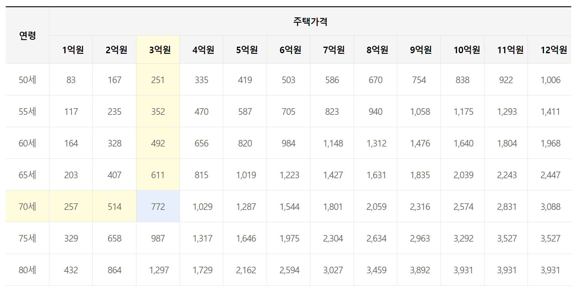 예를 들어 70세(부부중 연소자 기준)부부가 3억원의 주택을 소유하고 있을 경우 매월 77만2천원을 수령할 수 있습니다.