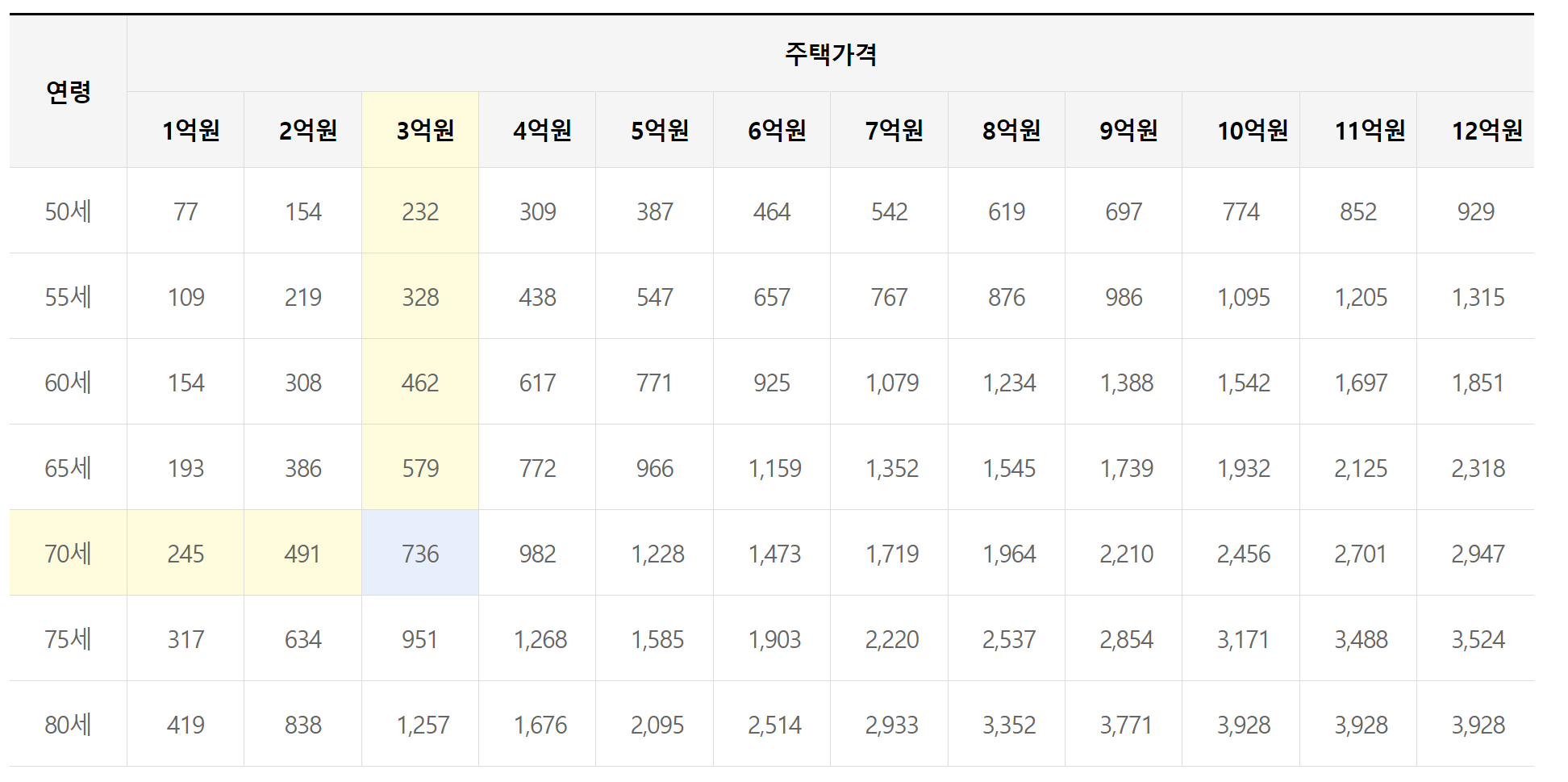 예를 들어 70세(부부중 연소자 기준)부부가 3억원의 주택을 소유하고 있을 경우 매월 73만6천원을 수령할 수 있습니다.