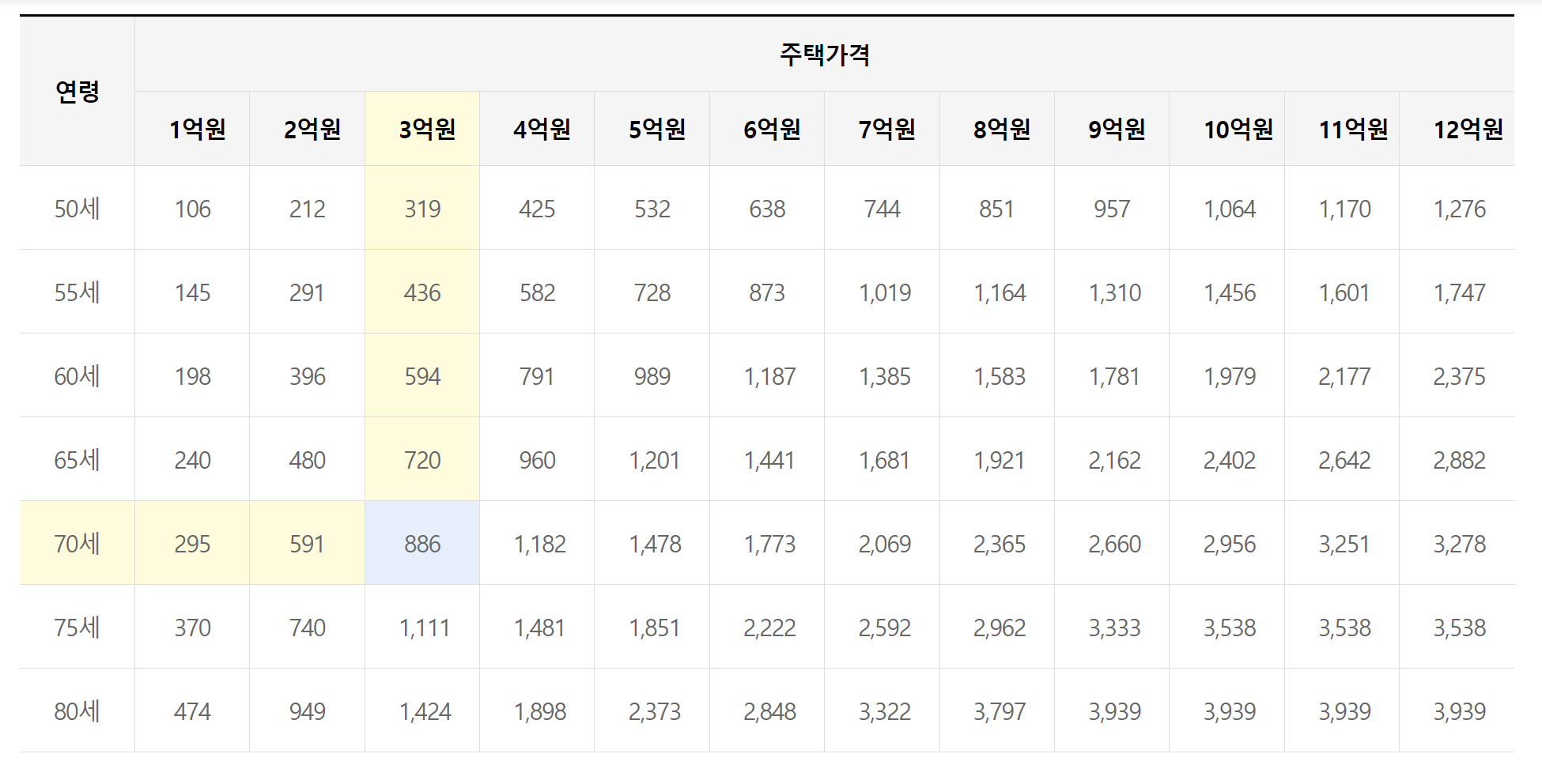 예를 들어 70세(부부중 연소자 기준)부부가 3억원의 주택을 소유하고 있을 경우 매월 88만6천원을 수령할 수 있습니다.