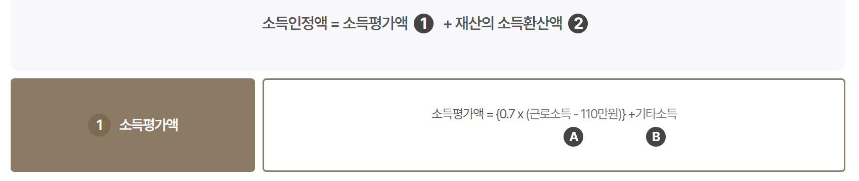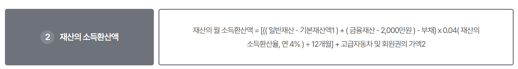 ✔ 재산 기준: 주택, 토지, 금융자산 등 소유 재산에 따라 소득 환산액 계산