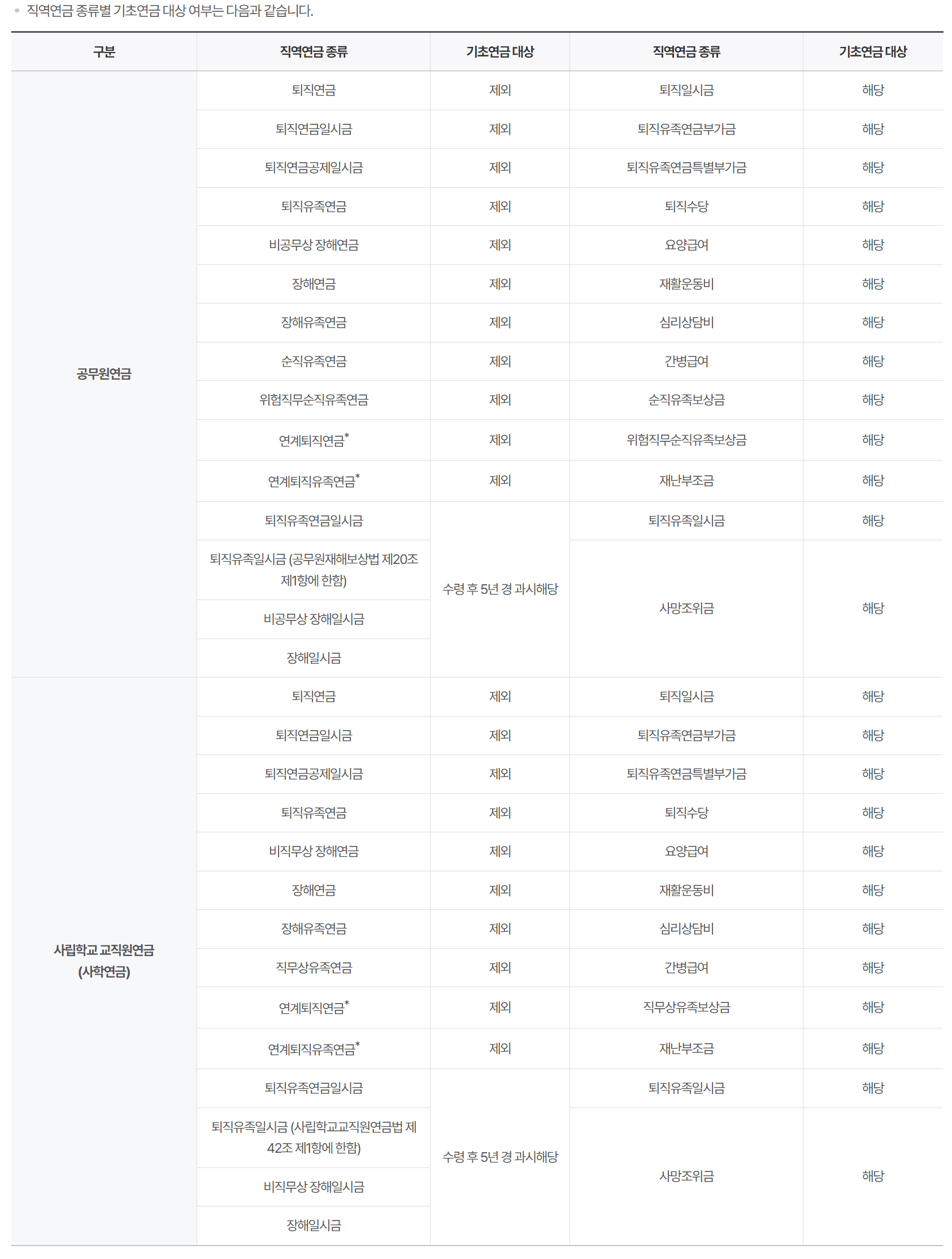 ✔ 공무원연금, 사립학교교직원연금, 군인연금, 별정우체국연금 수급자 및 그 배우자는 원칙적으로 기초연금 수급 대상에서 제외됩니다.