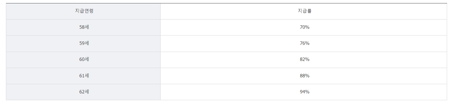 예) 1964년생 국민연금 가입자의 경우, 58세부터 62세까지 조기퇴직 시 지급률은 다음과 같습니다.