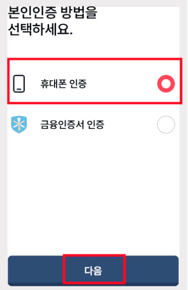 5️⃣본인인증 방법을 선택후 다음을 누릅니다.