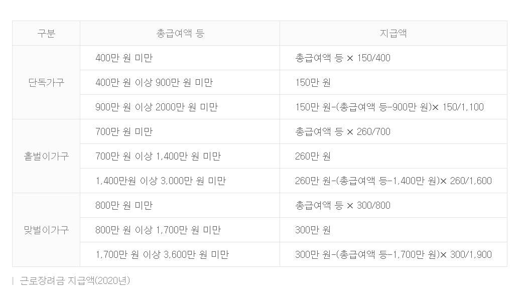 근로장려금은 맞벌이 가구, 홑벌이 가구, 1인 가구에 따라 지급액이 다릅니다.
