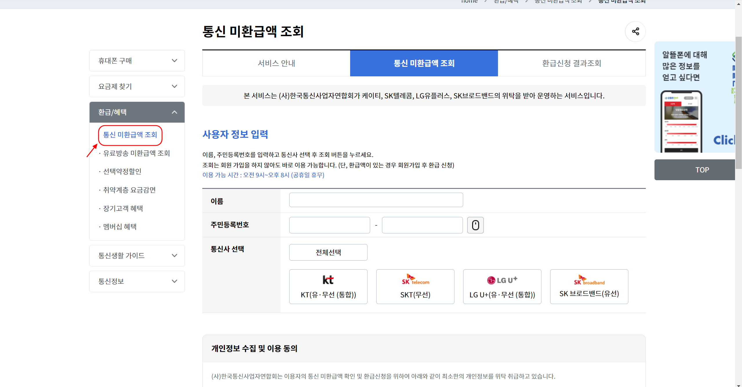 '통신 미환급액 조회' 메뉴에서 '미환급액 조회하기'를 클릭합니다.