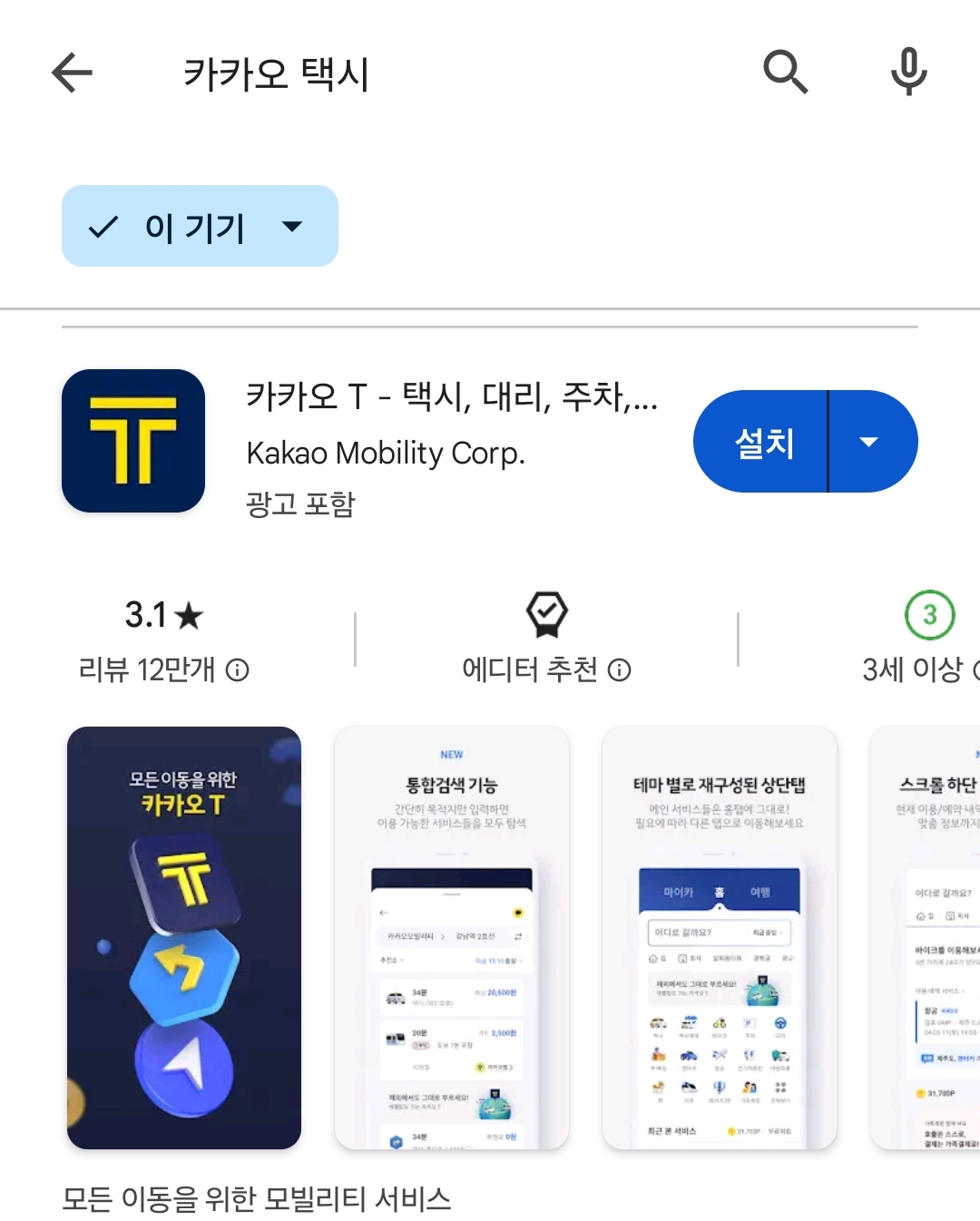 🔹'카카오택시' 앱을 선택한 후 '설치' 버튼을 누릅니다.