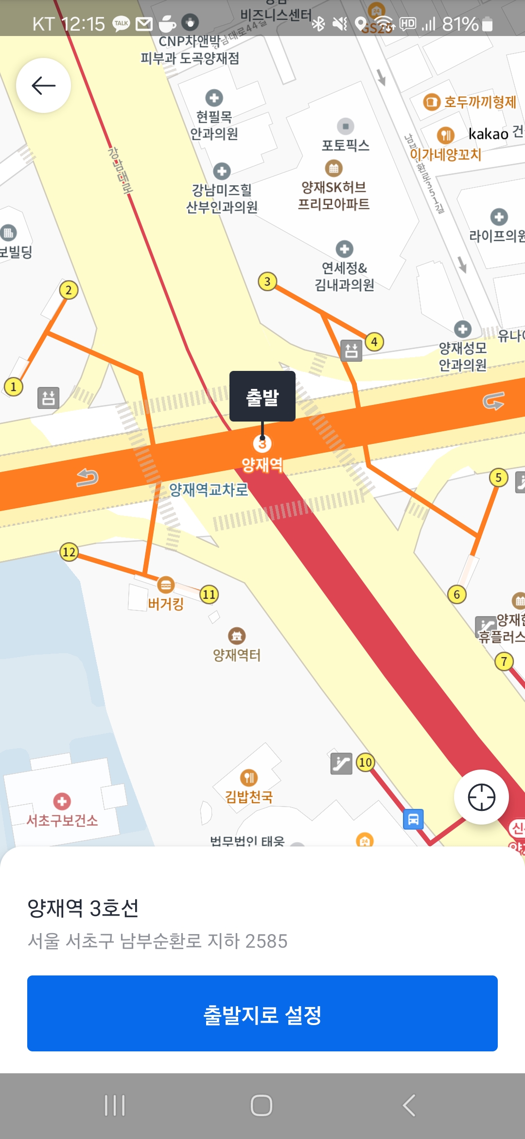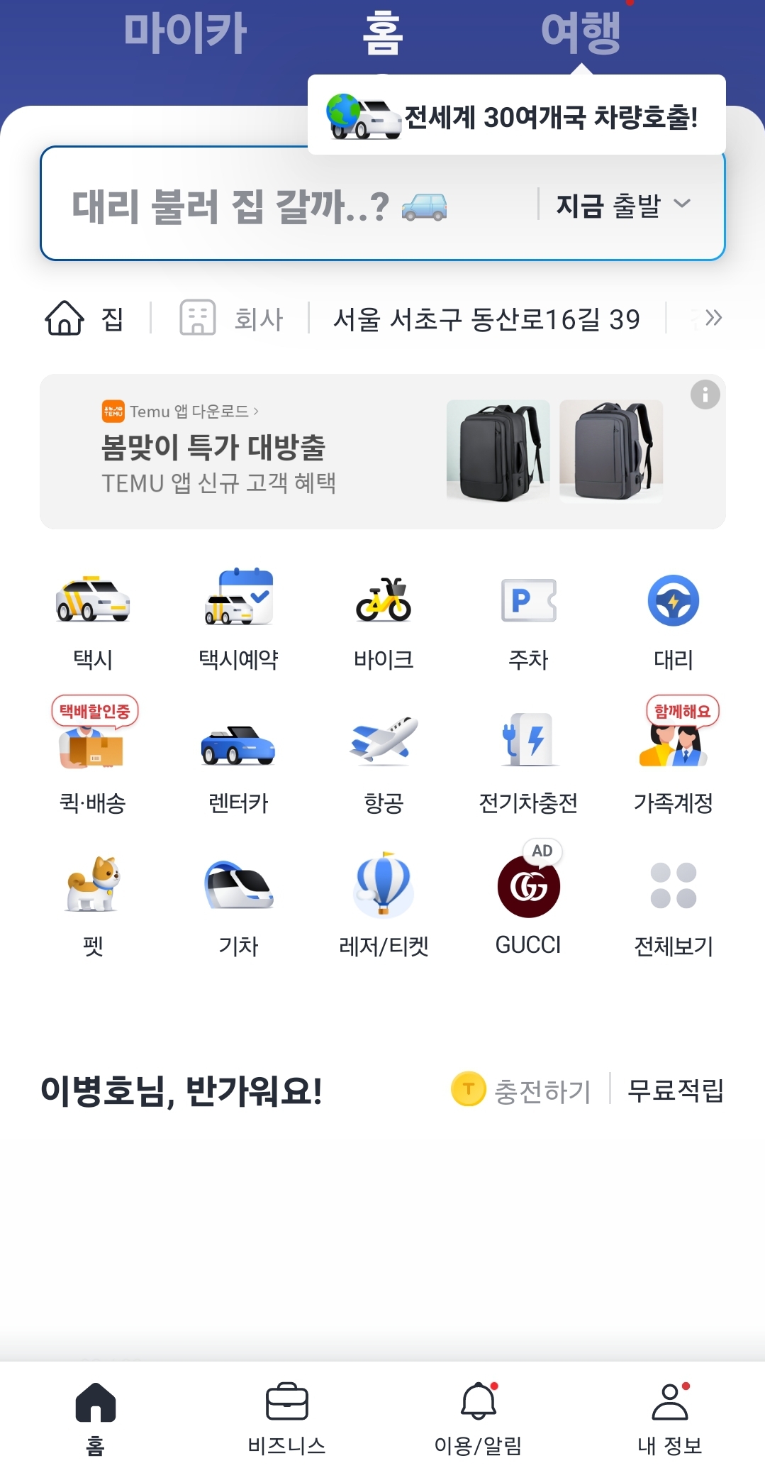 🔹카카오 T 앱을 실행하면, 현재 위치가 출발지로 자동 지정됩니다.