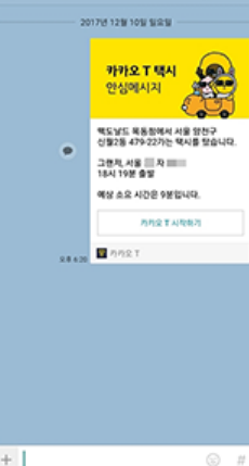 카카오택시는 안심메시지 기능을 이용해 카카오톡 친구에게 탑승 정보를 보낼 수 있습니다. 안심메시지에는 탑승지역, 목적지, 출발시간, 차종과 차량번호, 예상 소요시간 등이 나와 있어 낯선 장소, 늦은 시간에도 안전하게 택시를 이용할 수 있습니다.